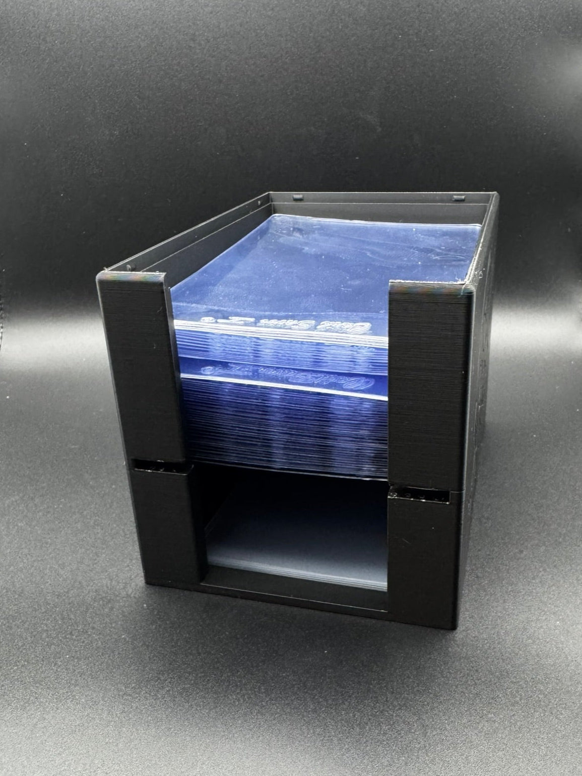 This dispenser holds up to 50 Card Saver 1 holders, keeping them organized and easy to access. The front opening allows for smooth 1 handed use so you can quickly grab a holder while keeping your setup neat and efficient. An optional snap in lid keeps the stack secure, and rubber feet prevent the dispenser from sliding around inside your workspace.